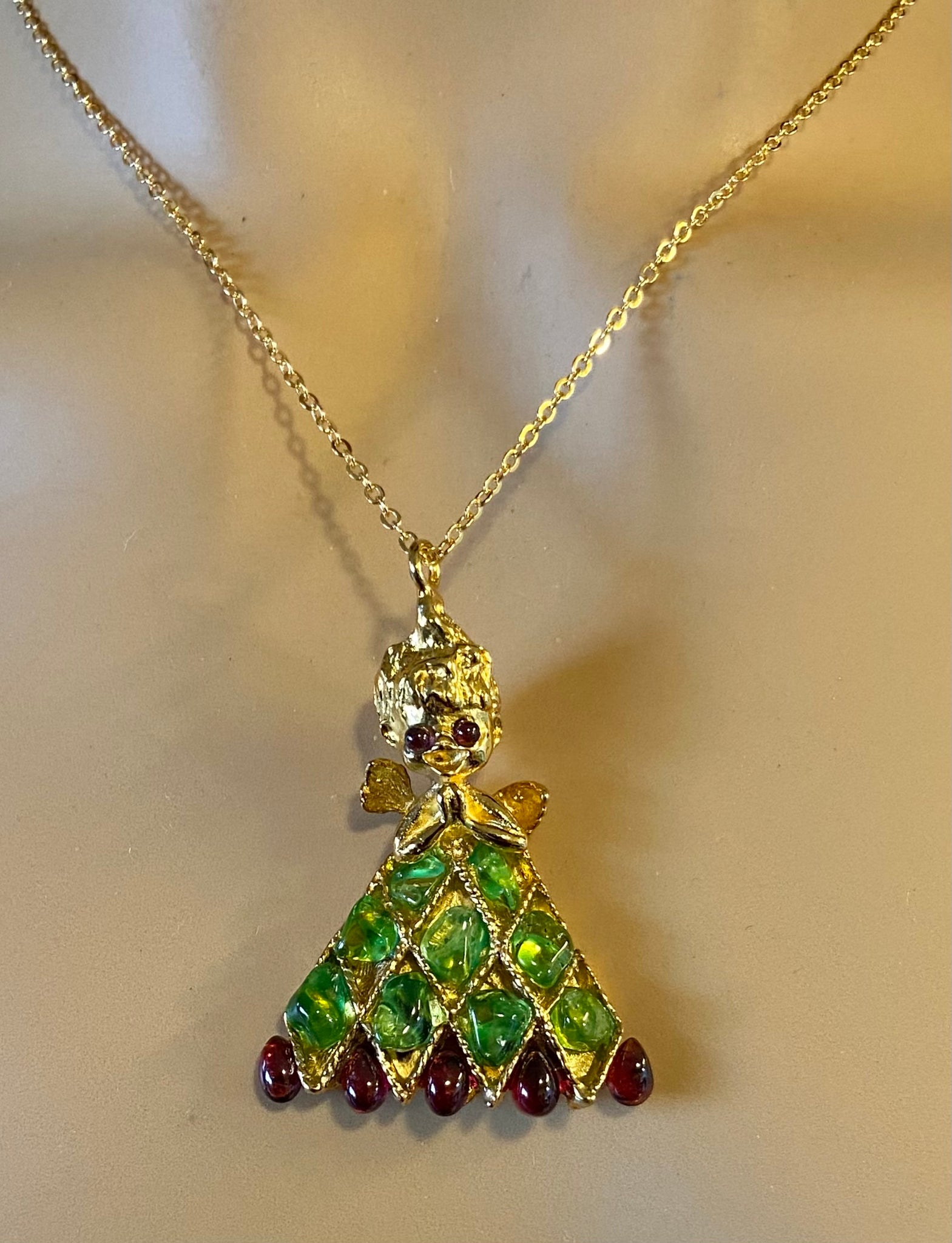 Authentic Swoboda Christmas pendant, signed Swoboda, measuring approximately 1-1/4" x 1-3/4", which is in excellent condition. This Swoboda Christmas Angel pendant is done in 24 kt gold plated, and is adorned with peridot and garnet. This brooch is handmade in the United States.