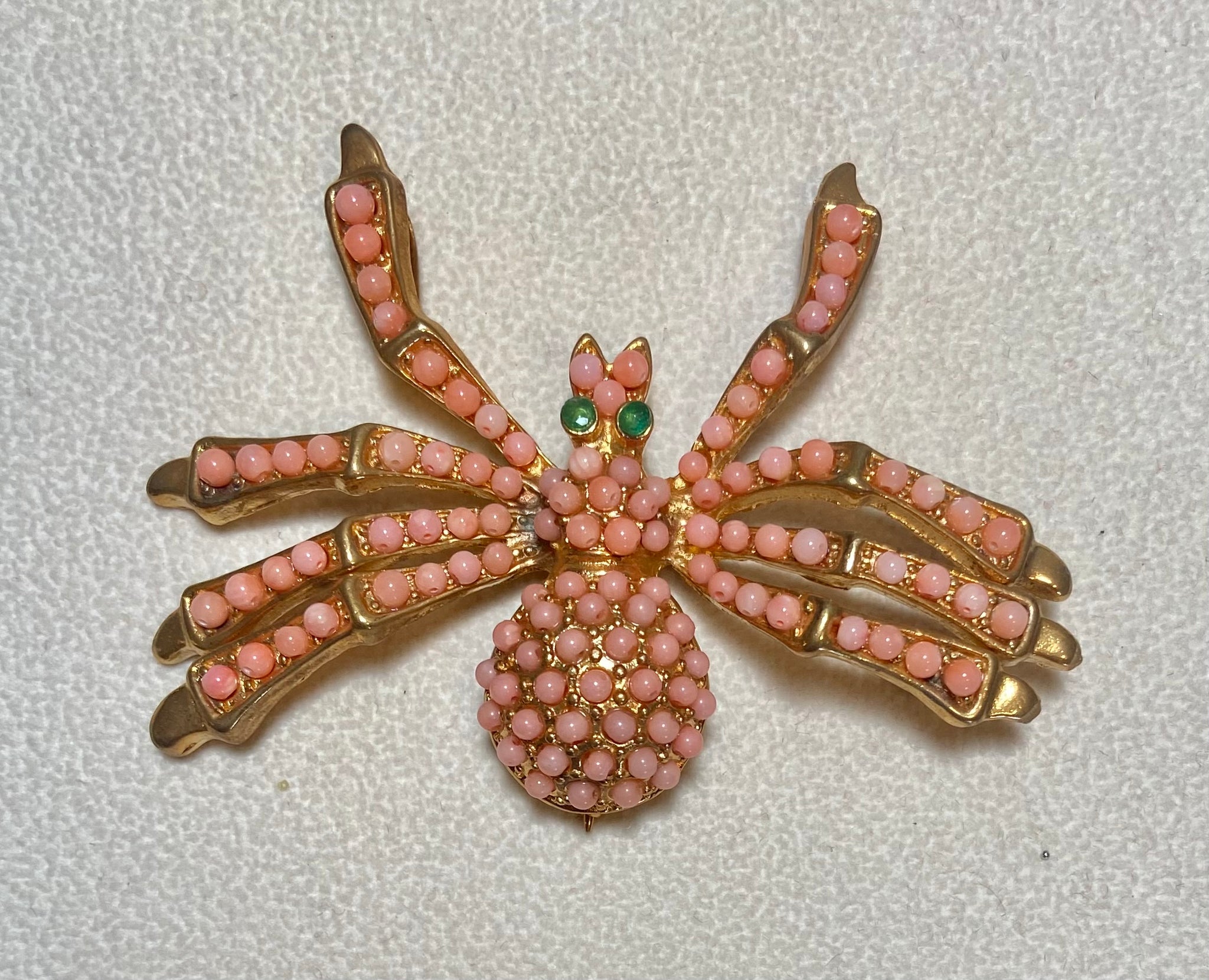 Authentic Swoboda spider pin/pendant, signed Swoboda, measuring approximately 3" x 2", which is in excellent condition. This Swoboda pin/pendant is done in 24 kt gold plated, and is adorned with coral and emerald eyes. This brooch is handmade in the United States.