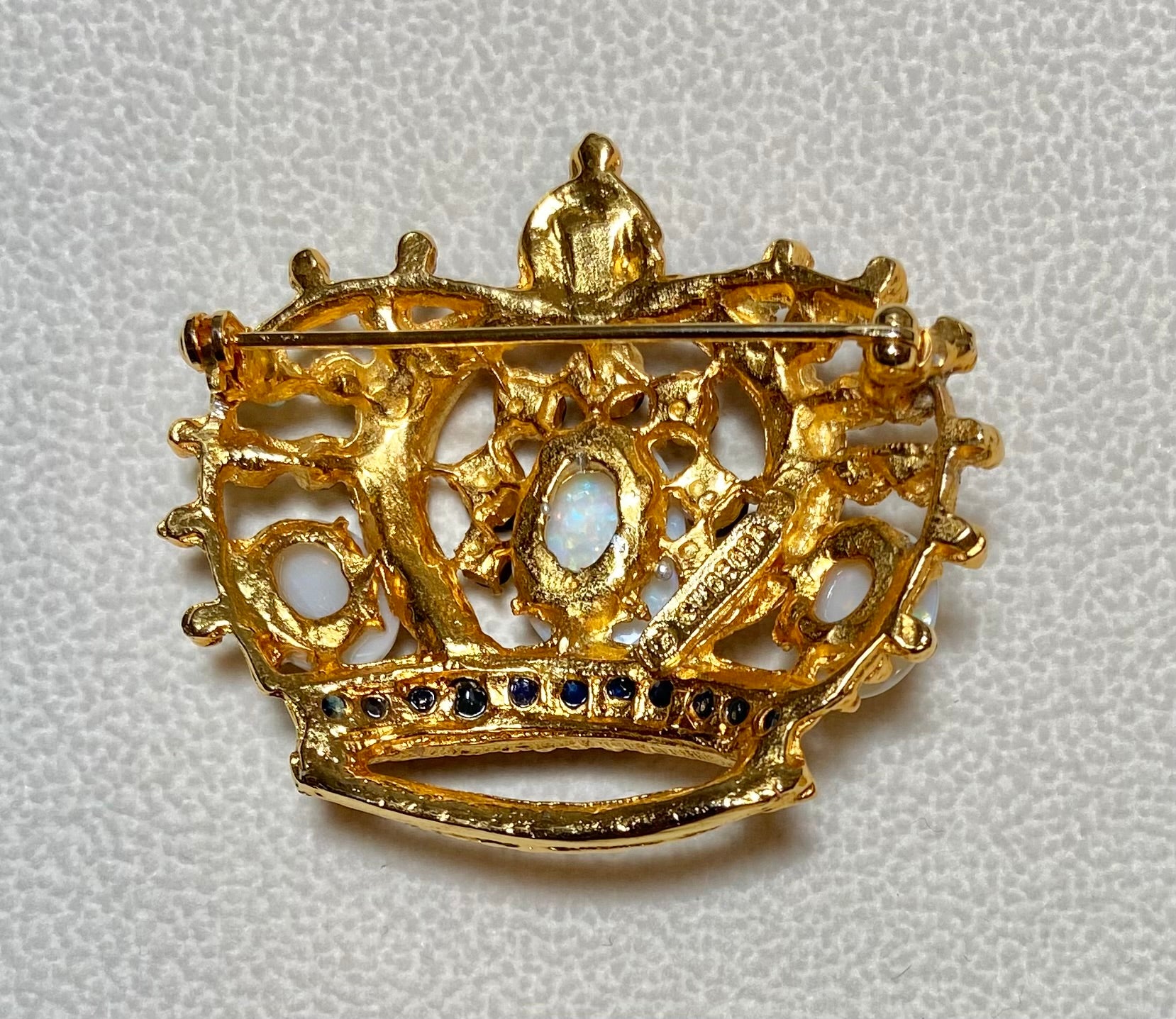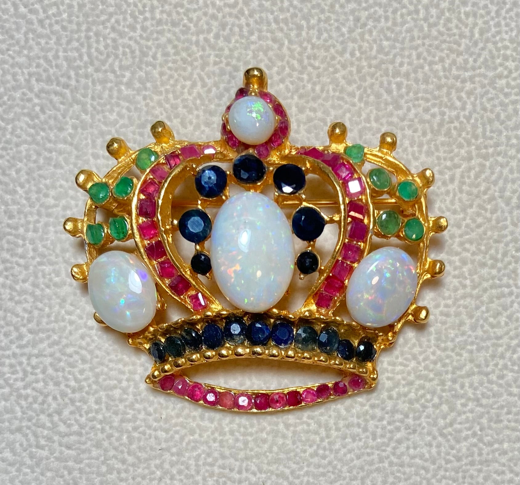Authentic Swoboda crown brooch, signed Swoboda, measuring approximately 1-3/4"x1-5/8", which is in excellent condition. This Swoboda crown brooch is done in 24 kt gold plated, and is adorned with genuine opal, ruby, sapphire and emerald. This brooch is handmade in the United States.