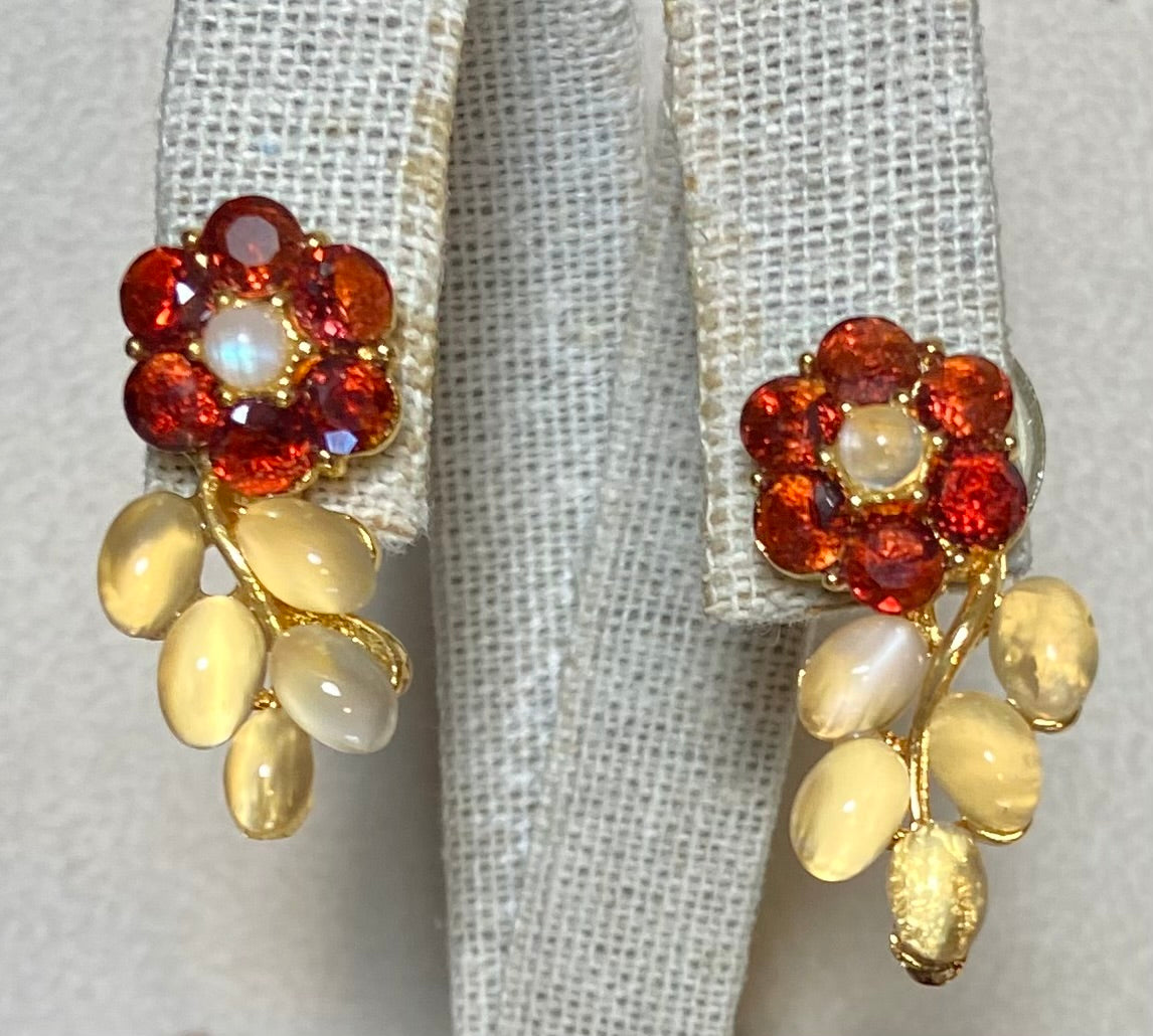 Authentic Swoboda earrings, comes with Swoboda tag, measuring approximately 1 x 1/4", which is in excellent condition. This Swoboda earrings is done in 24 kt gold plated, and is adorned with moonstone and garnet. Pierced. This earrings is handmade in the United States.